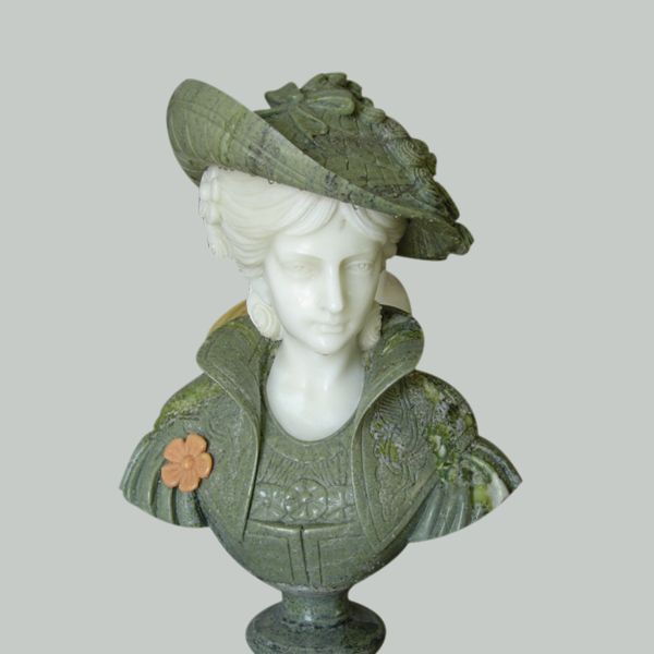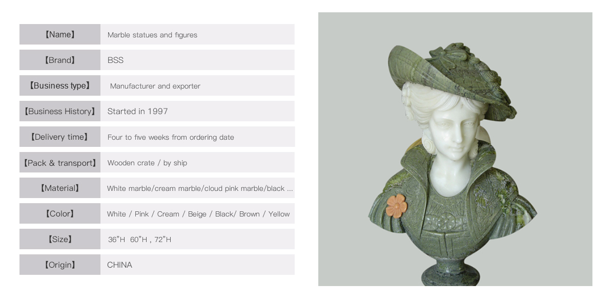 Thisexcellent bust is reproduced many times by our carving team. All details ishand-carved in solid green and white marble. A separate pedestal is included inthe bottom to suit the bust. We have many similar marble busts in stock forimmediate delivery. Delivery time is 3weeks to ship from China sea port.