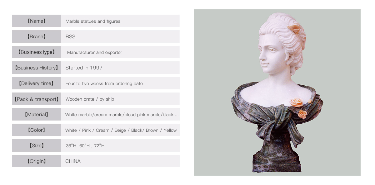 The Green and white marble are popularand beautiful marble for statues. This lady bust shows happy expression on herface , the shaped pedestal and carved dresses add the beauty of this masterpiece. Everthing is hand-carved by our top craftman with long years experience.