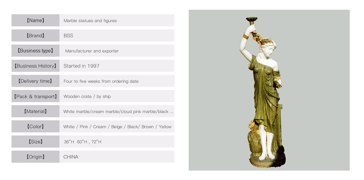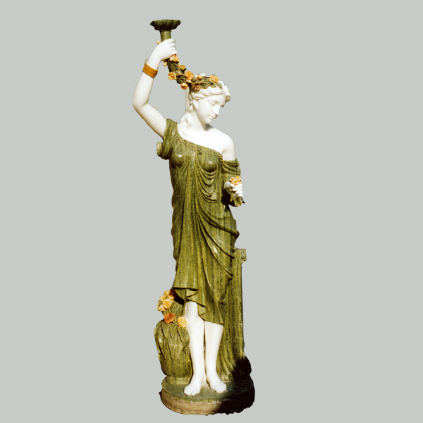 Character : Natural marble / solid and hard / polished / white and green color,This beautiful lady figure is finely made in two types of marble, with lighting device. All details is hand-carved by our sculptor to show high quality marble work in your estate.Delivery time is 3 weeks to ship, many figures are available in stock for immediate delivery.
