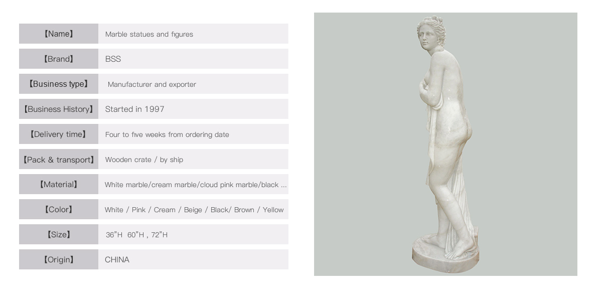 Character : Natural marble / solid and hard / polished / white color.This is a famous and beautiful reproduction of venus statues from natural white marble.