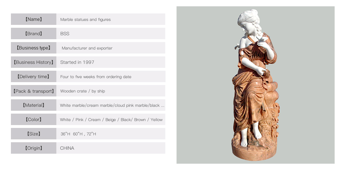 Character : Natural marble / solid and hard / polished / multicolors.This beautiful girl statue with bird on hand is finely made in two kinds of marble.