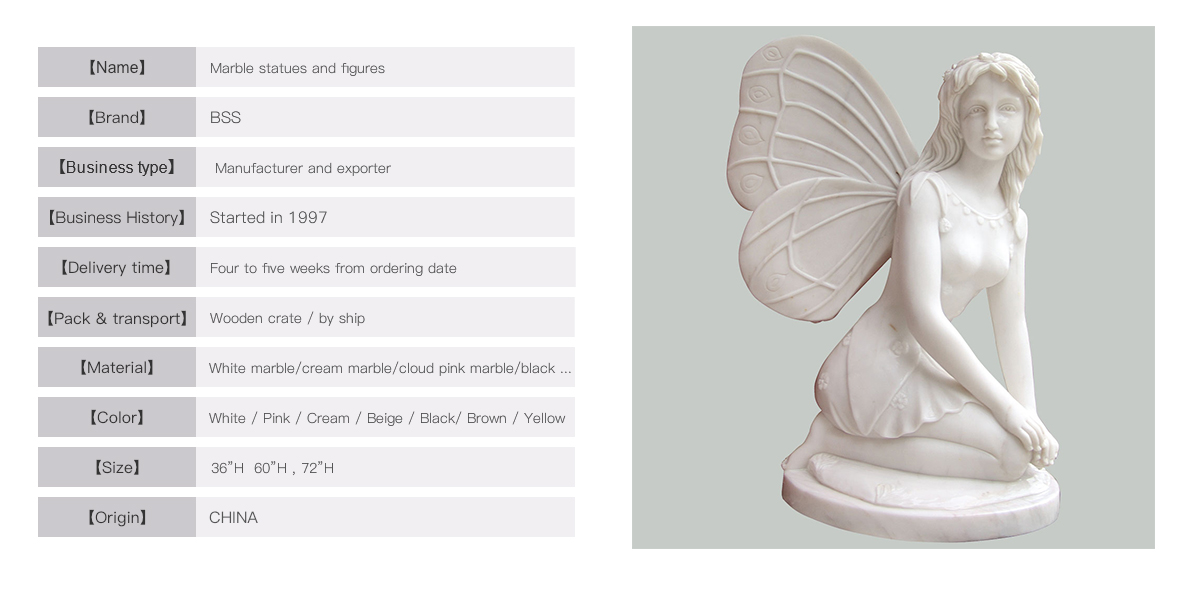 Character : Natural marble / solid and hard / polished / white color.This beautiful bee girl statue is carved by our master sculptor in one piece of white marble.