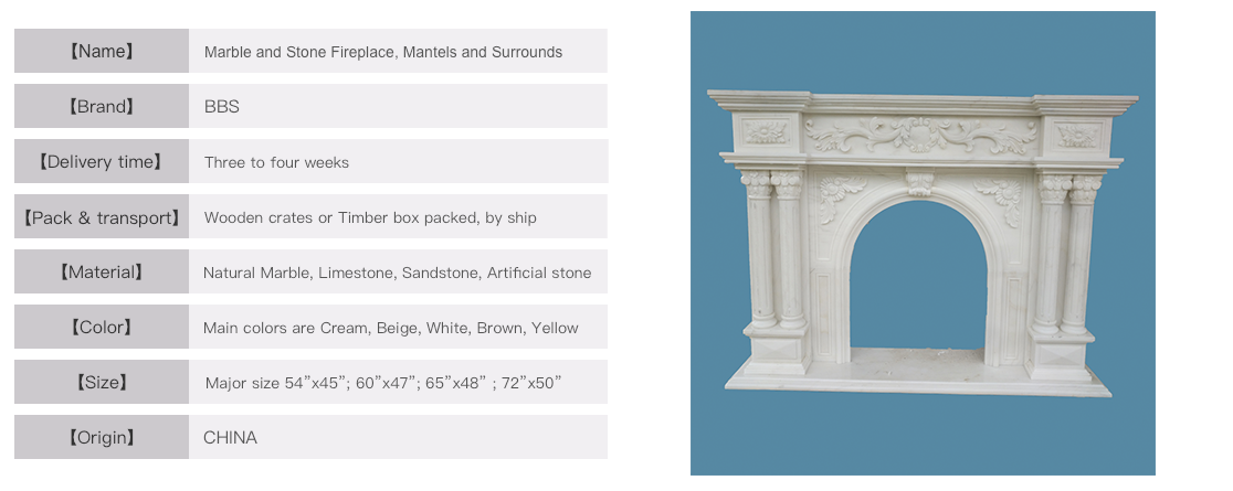 Description | This beautiful marble fireplace is carved in a warm tone marble, made up of 8 pcs marble. The back panels are included to suit the fire opening, all packed in one wooden crate. Supply capacity is 10 to 15 containers monthly, mostly to UK, Ireland, Russia and America. Single or several units, or full container are all available to supply and material can be changed. |