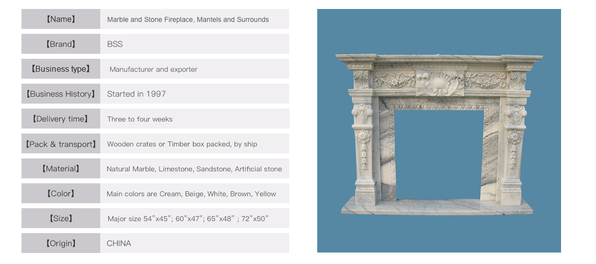 This beautiful fireplace mantel is hand carvedin white with veins marble by our craftsman.