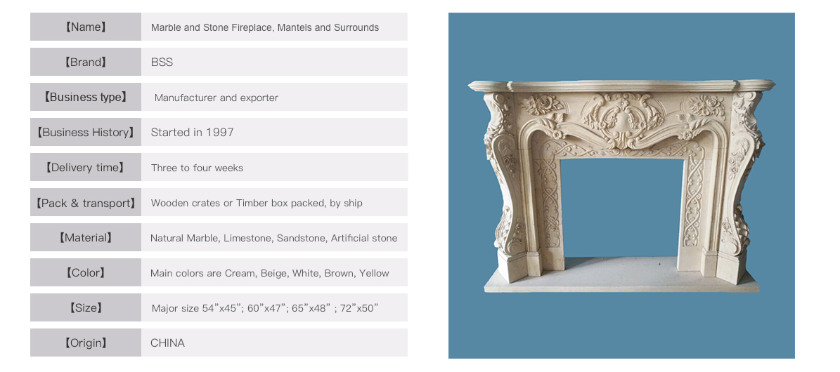 Description | This beautiful marble fireplace is carved in a warm tone marble, made up of 8 pcs marble. The back panels are included to suit the fire opening, all packed in one wooden crate. Supply capacity is 10 to 15 containers monthly, mostly to UK, Ireland, Russia and America. Single or several units, or full container are all available to supply and material can be changed. |