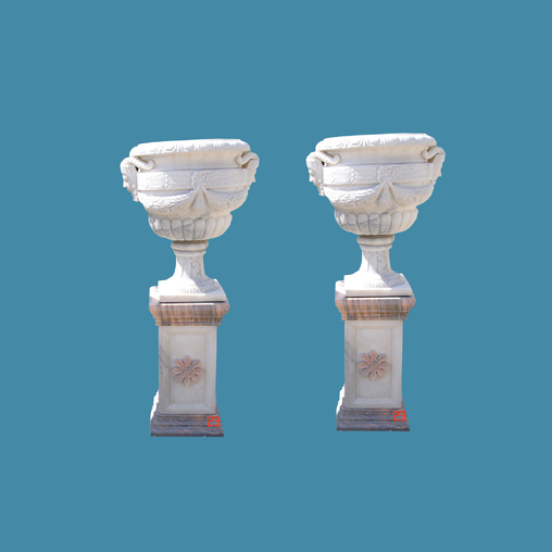 Character:natural marble/solid with veins / honed finish / Beige color. This beautiful natural beige stone is good choice to make this type of flowerpot. It looks like antique finished pots from old period. A high pedestal to suit the top fully carved urn with angel statues and flower patterns make it look really amazing. It is good treasure to enjoy long time in your luxury estate. Contact us immediately to get more information to purchase.