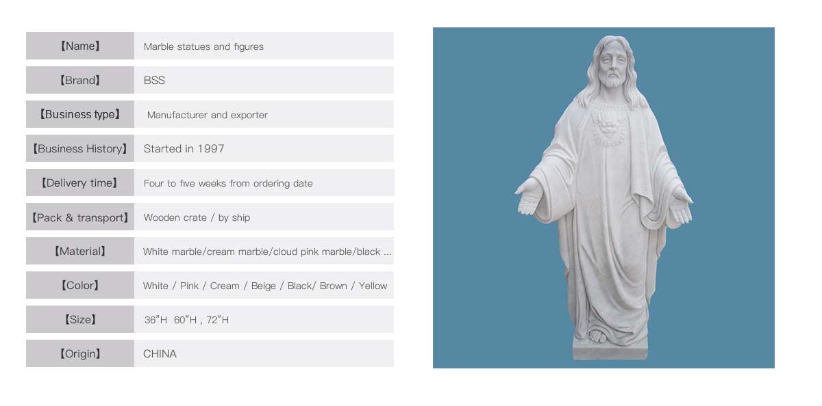 There are two major size 60” and 71”height for this Jesus sculpture. A separate pedestal can be added to make thesculpture looks larger and greater. It does enhence the beauty of your home décor.Contact us immediately to get more infromation about this statue.