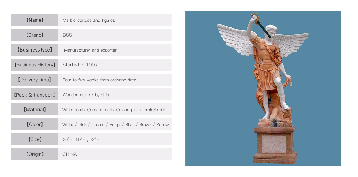 This is also one of famous Greek fairytails, a warrior statue with wings and hold a sword to kill the monster. This grand marble figure is hand-carved tosuit on a solid pedetal to enhance the mightiness and the beauty of the warriorstatue.