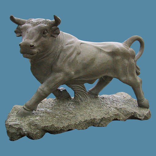 This elegant bull statue on rock base is carvedfrom a one piece of grey sandstone .