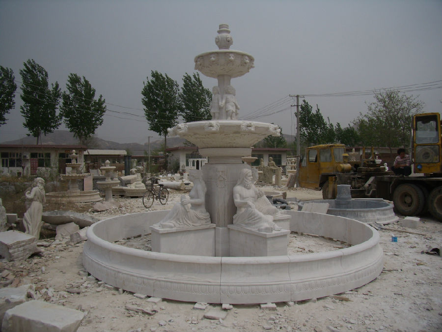 This gorgeous white marble fountain is fully hand-carved with some man and woman statues, children and lions head.Water flows out of the lions head into the water bowls and then to the bottomround pool. Everything is finely made to create this master marble piece to enhancethe beauty of your house. Dimensions and material for this water fountain canbe custom made.
