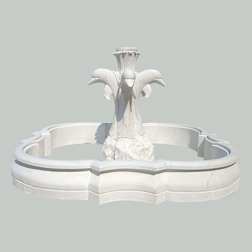 This marble fountainwith a special circled surrounding pool , is pure elegance with its hand carved dolphins features to place in yourestate. Use the most popular whitemarble, it can last long decades and notpolluted. Labor can easily move theseparate marble pcs to install, and then fix the pool base parts well to makewhole fountain working nicely.