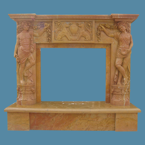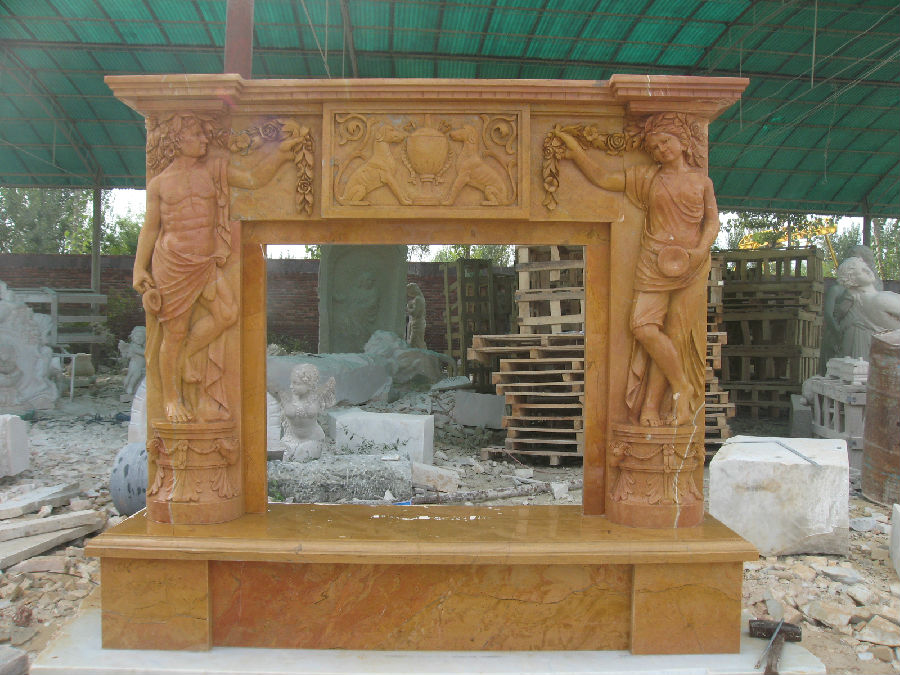 Character: Natural marble / solid with veins / polished / yellow color.This beautiful yellow marble mantel is hand carved with statues , animals and flower patterns