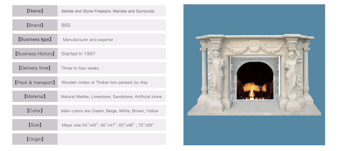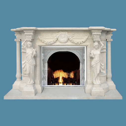 Character: Natural marble / solid with veins / polished / white color.This beautiful marble mantel with statues and patterns is hand-carved in white marble.