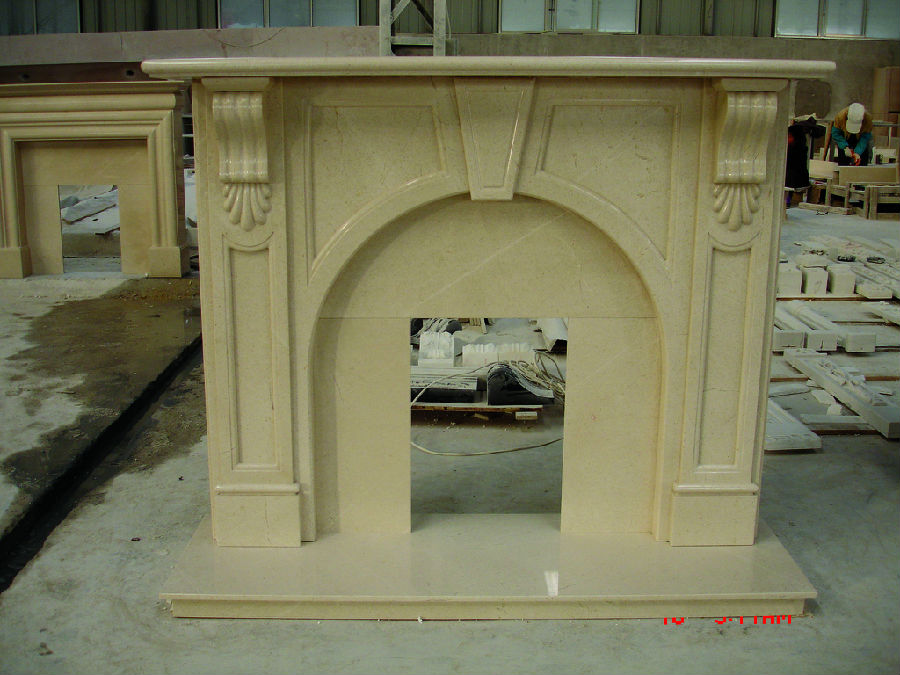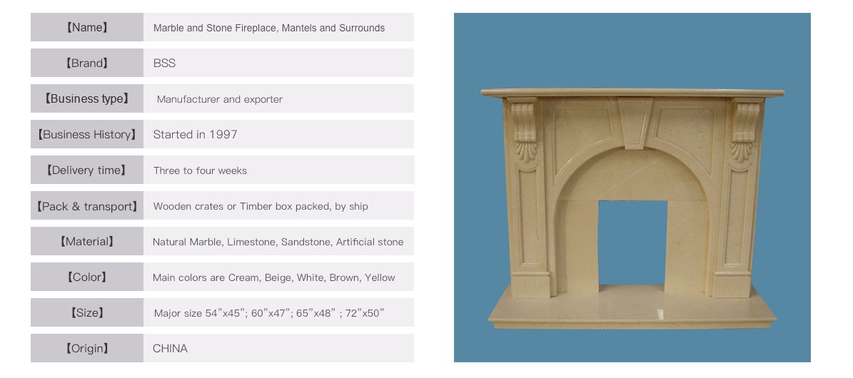 Character : natural marble / solid with veins / polished / cream color.The is one of major mantel designs which is sold very well in Europe. Common size is 54” and 60”with standard opening 36”x36”, popular material is white marble and cream marble. Hearth and back panels can be included to suite this surround well. One 20ft container fit about 65 mantels and delivery time is 3 weeks to ship.